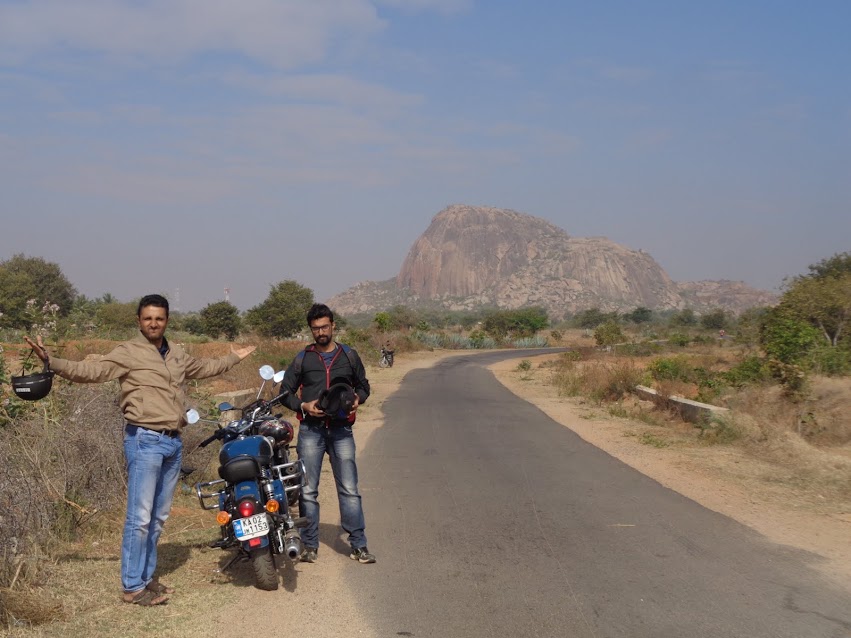 After some yummy breakfast, we rode into Dobbaspete and took the road towards Madhugiri. The roads were freshly laid but the amount of speed breakers was little too much. We continued to maintain good pace to reach Koratgere. Deefu & me were reminded of the “muddhe oota” & “goli soda” we had had at the bus stop 5 years back returning from Channarayanadurga. We continued towards Madhugiri. We could spot the might Channarayanadurga standing in all her glory waving at us. it was not long before we could spot the mighty Madhugiri, the very sight of this hillock sends chills down my spine. TIME: 09:45