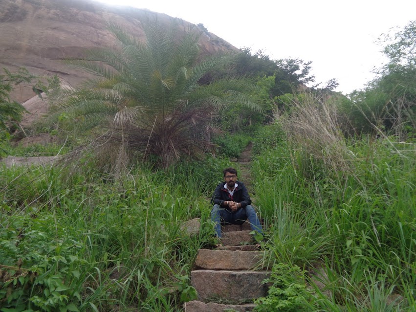 We decided to head diagonally as it would be less tiring and would give a better sense of balance. But we got stuck in a spot where we couldn’t finding a proper footing nor a proper crack to pull ourselves up. Deefu made it up and then was watching me, I almost slipped but pushed myself and grabbed a bunch of grass and pulled myself up. Whew! Then again we found ourselves stuck with in between trees and bushes. We decided to explore the perimeters. Pulling ourselves on top of a fort wall we made it to the final tier. Even the last bit offered us a steepness, it was we who were scaling up the wrong side of the mighty hillock. Lastly, we decided to climb up this one using what we coined “controlled momentum” it was more 4 legged crawl. Finally we climbed up the final fort wall to reach the top. A cool breeze greeted us! We could see Shivagange afar, we waved back her too!