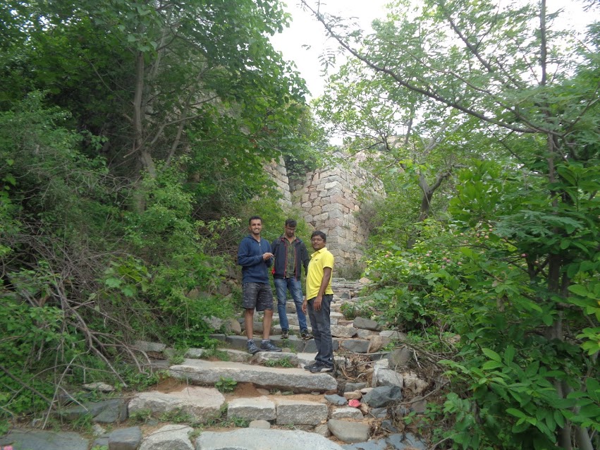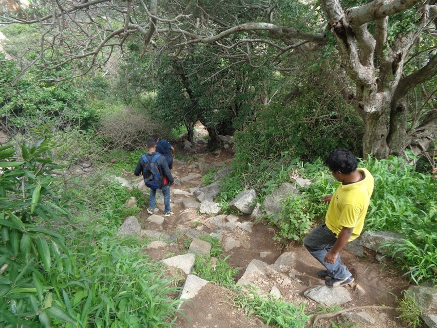 Alright it, this was the easiest of stretches. And the quickest one to complete as well. We locked the summit into our minds and didn’t waste much time finding the initial trail. The priest had pointed afar a fort wall to reach and we intended to do that as a part of the first phase. Once we found the trail there were neatly laid rocky pathway with steps here and there which lead us directly to the fort wall. The temple was already afar.