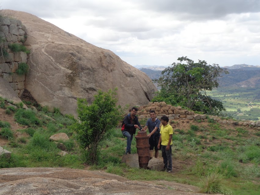 The descent was a quick one and easy to start off with. We glided, slid, hovered our way down with ease. One thing we made extra sure is to get a firm gripping on the very next step as every slip would have cost us. In about 15-20mins we were down the final stretch and entered the old granaries and settlement area. There were ruins of ancient temples and old building all around us. But the most significant find was the two cannons that lay scattered in this area.