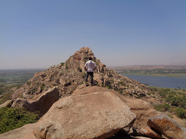 As we reached the top, I was disappointed to see the pillar pushed down and broken. Hoping the same would happen to the bones of the people responsible, we took out the water bottle and had a sip each. As I removed a complete packet of Mazello, Madhu burst into laughter. We had a few pieces each and began exploring the top. After finding a nice place for photography. We made into the shade amidst the rocks and rested for about an hour. TIME: 11:00