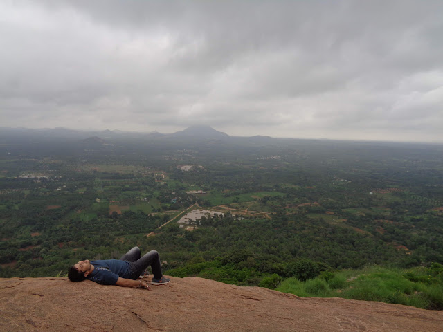 But Avi was a natural at climbing and we were making good progress even though the ascent was getting steeper. Carefully reading the cracks and resting in between when needed we made it to a point where we could spot the top. Here we rested for a good 10-15mins just looking at Shivagange and finally proceeded to reach the top.